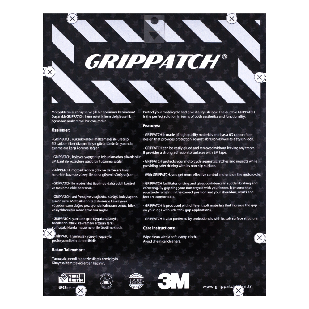 Grippatch’in asıl amacı, motosiklet kullanıcılarının konforunu ve güvenliğini en üst düzeye çıkarmaktır. Ürün, sıradan bir sticker değil; özel bir kaydırmaz yüzeye ve 6D karbon görsel yapıya sahiptir. Bu özellikleriyle hem dayanıklıdır hem de estetik bir görünüm sağlar. Grippatch'in benzersiz yüzeyi sararma veya soyulma gibi problemler yaşatmaz ve 2 yıl üretici garantisi altındadır.